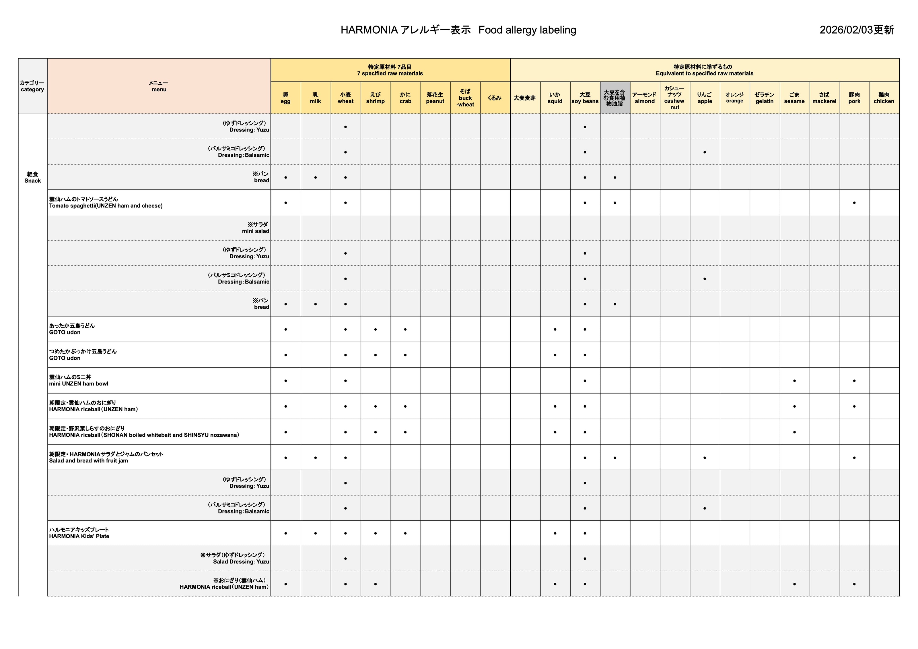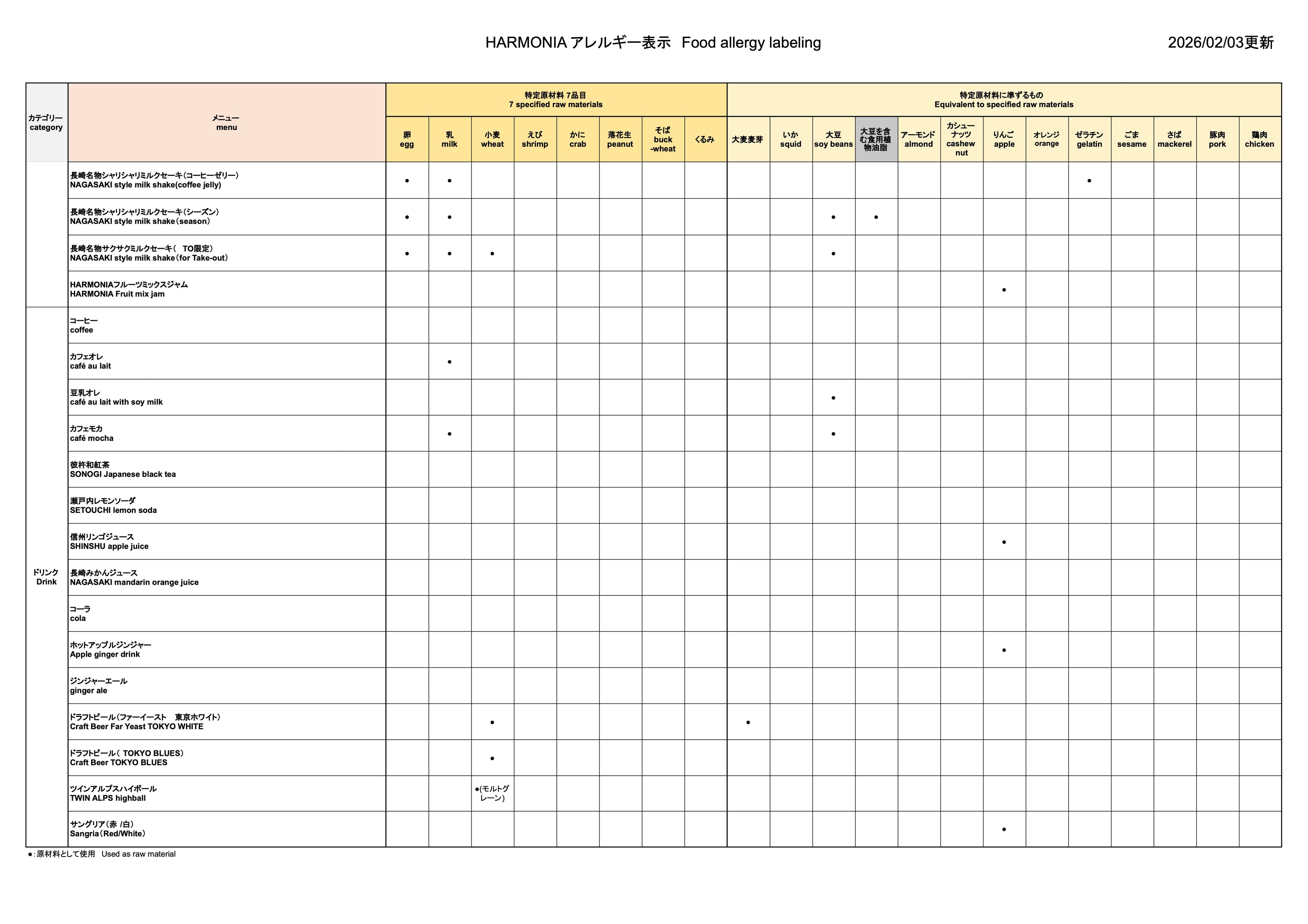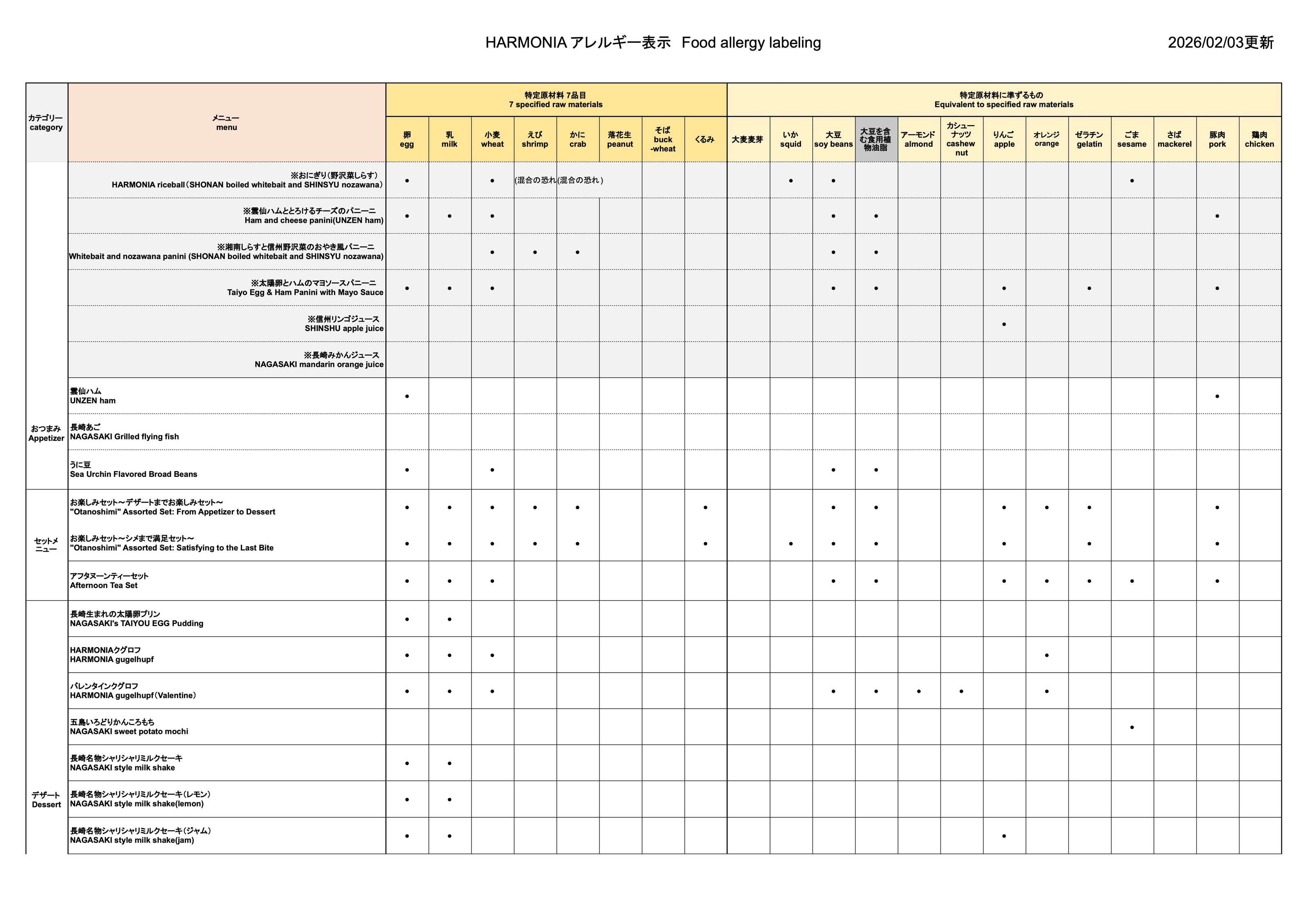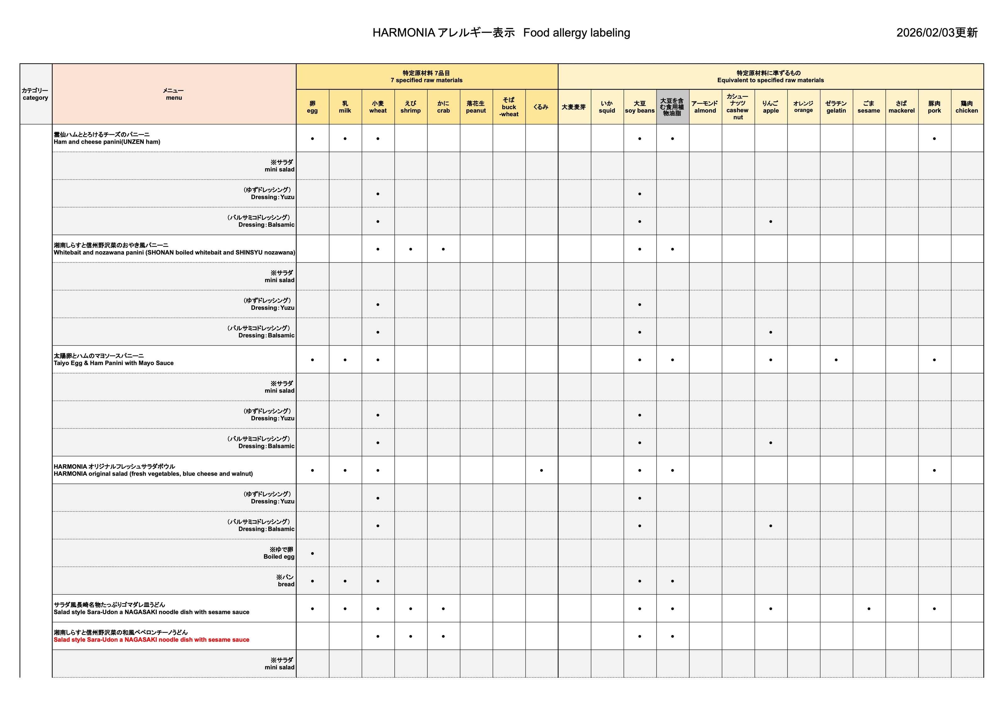 Caféメニュー・アレルギー情報一覧