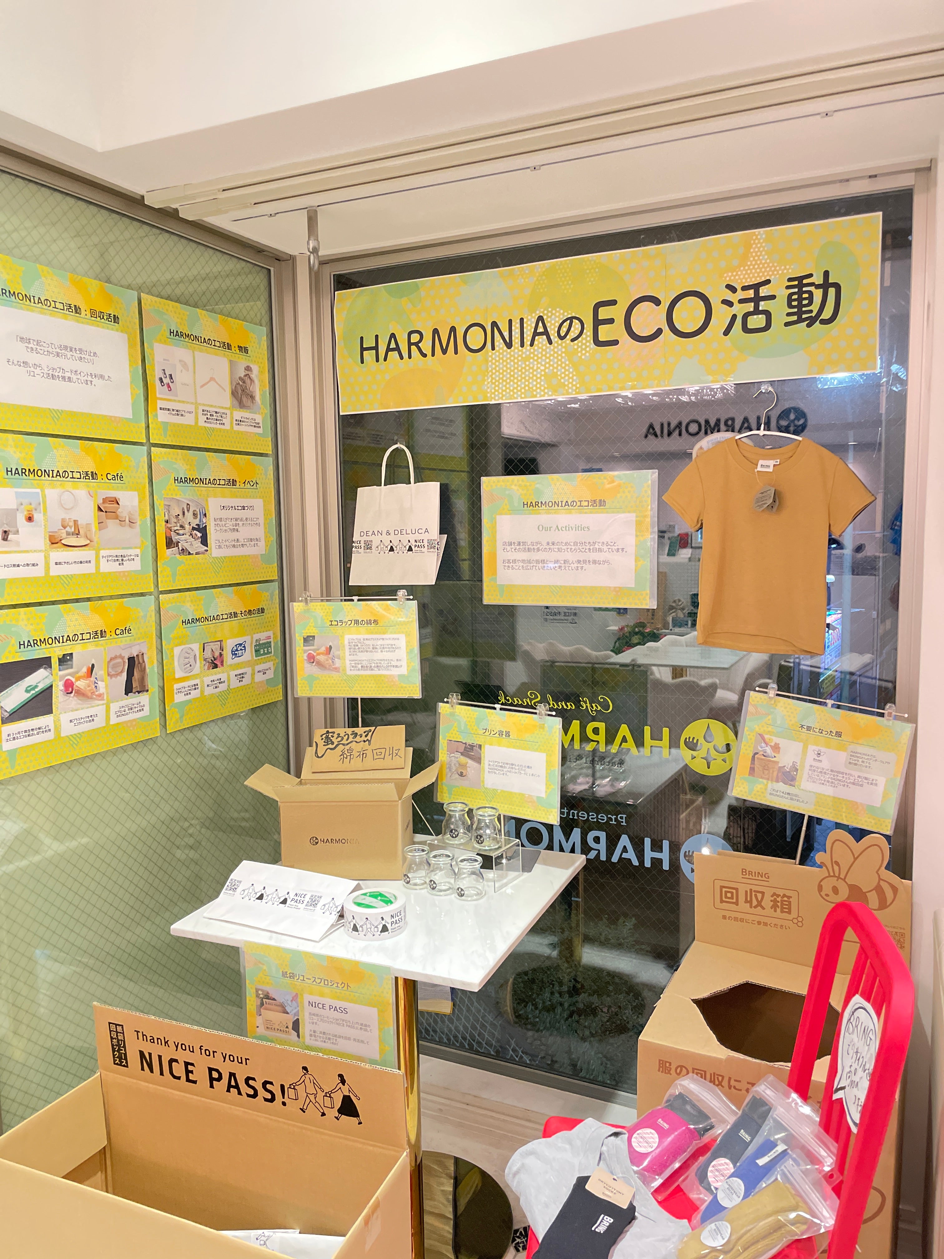 Report只今、HRMONIAの一角に設けた展示ブースでは「エコ活動強化月間(11/14まで)」として、不要となった服や布地・プリン瓶などの回収を呼びかけています。