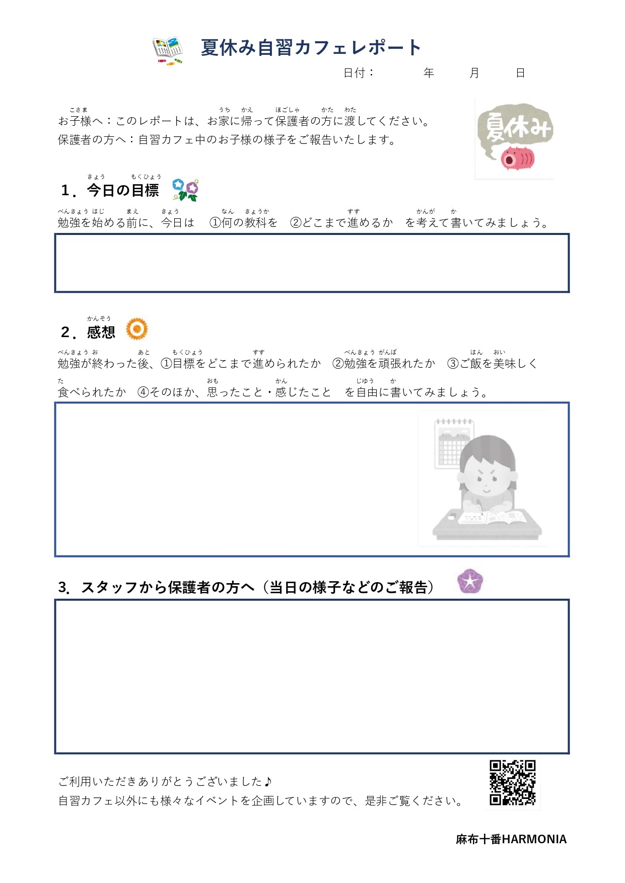 ※小学生の保護者の皆様には、自習カフェでの様子と成果がわかる報告レポートをお子様と作成の上、お渡しします。