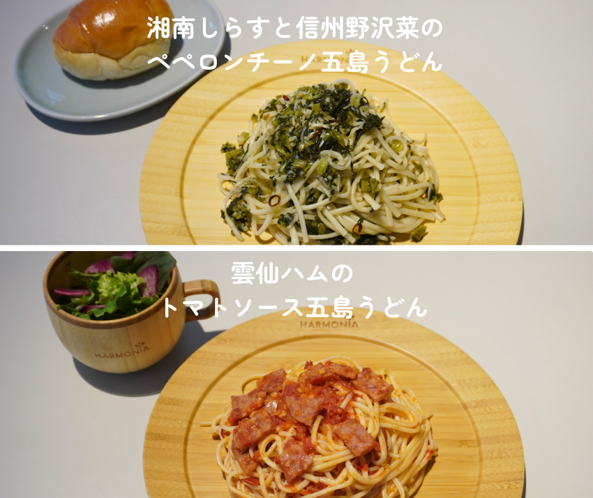 美味しさUP♪雲仙ハムのトマトソース五島うどん,湘南しらすと信州野沢菜のペペロンチーノ五島うどん(各¥1,300)