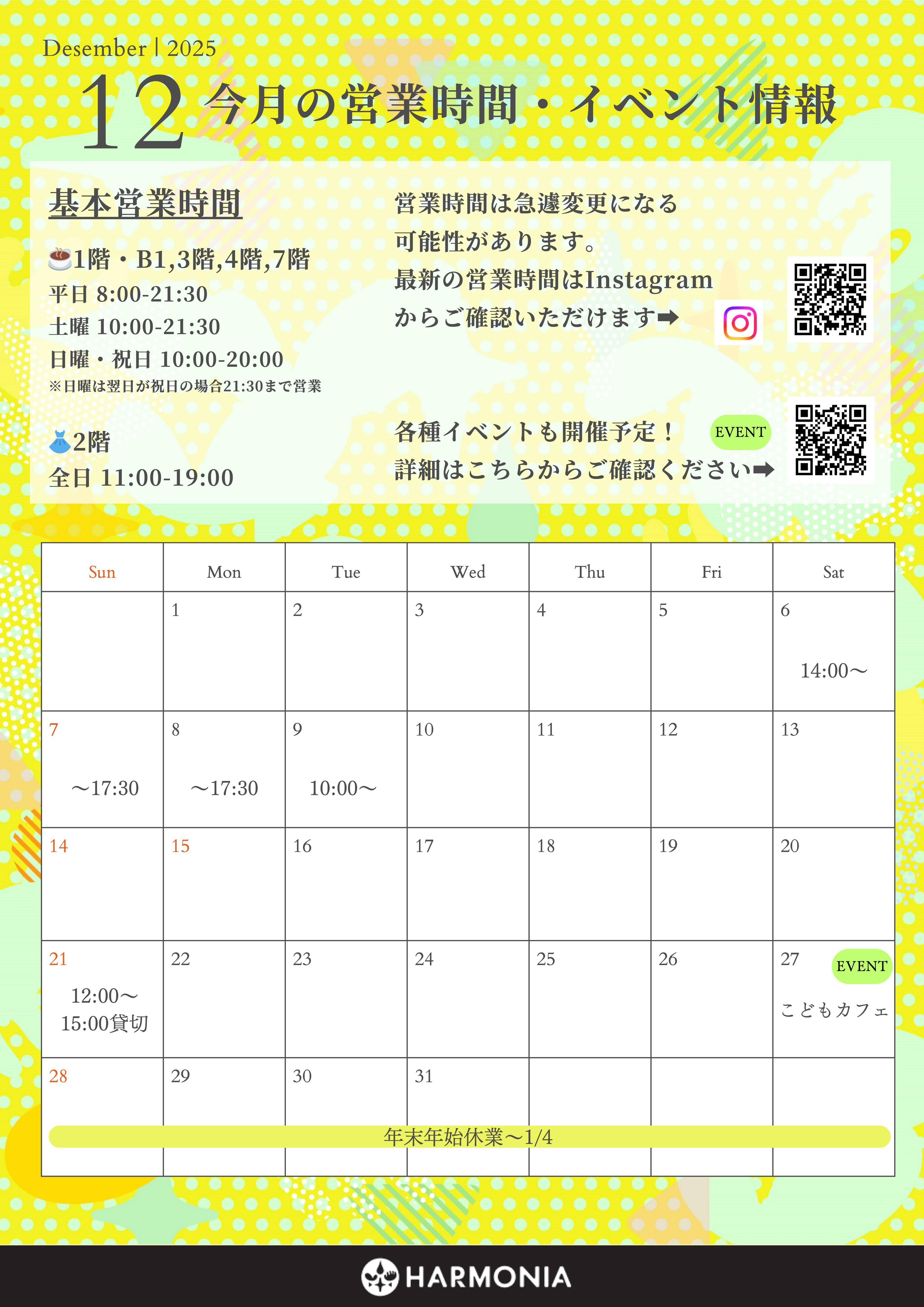 毎月の店舗営業時間詳細はInstagramにてご案内しております ※ハイライトをご確認ください