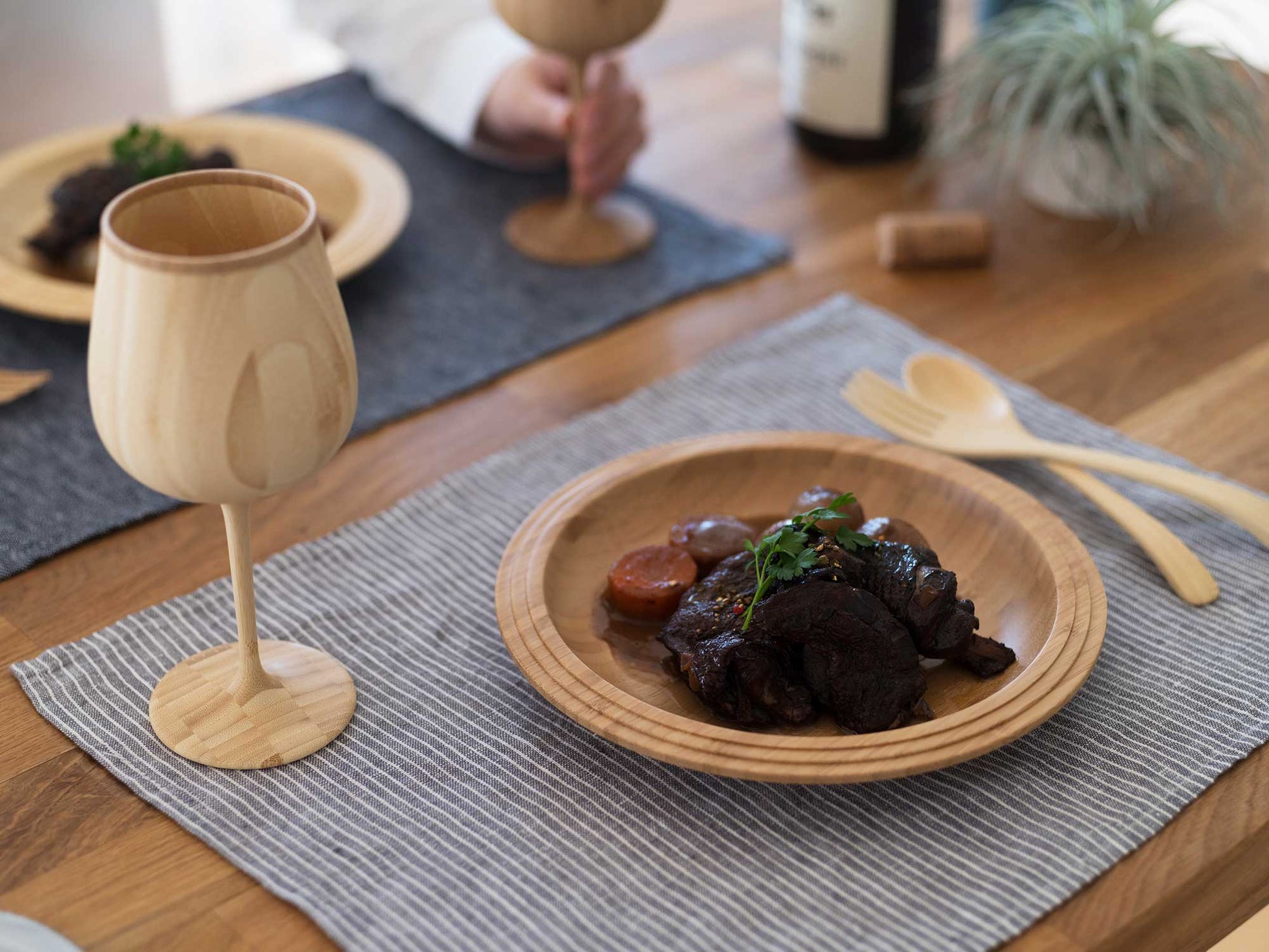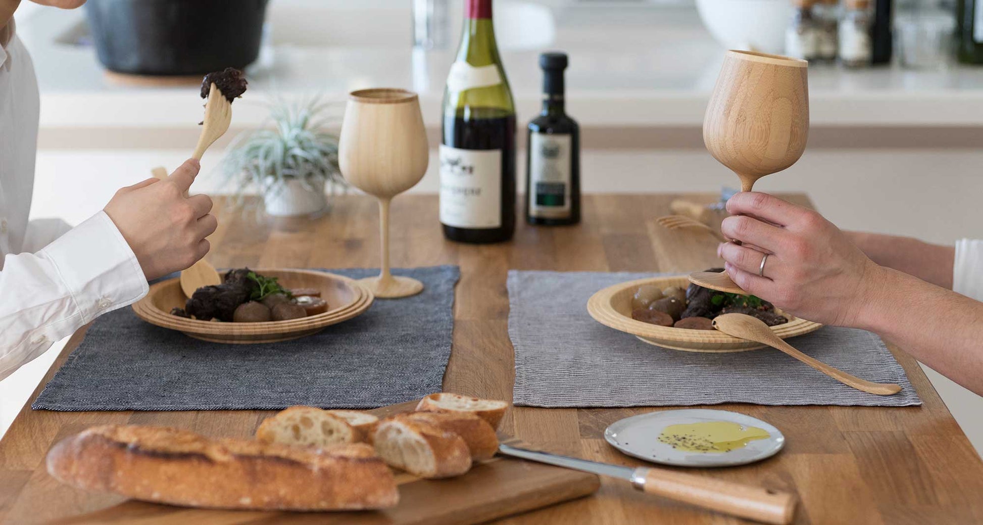 硬さを感じやすい陶器やガラス製食器とくらべ、見た目も質感もやわらかな天然素材食器。「しっくりとなじむ手ざわり」と「やさしくなめらかな口あたり」は天然素材ならでは。