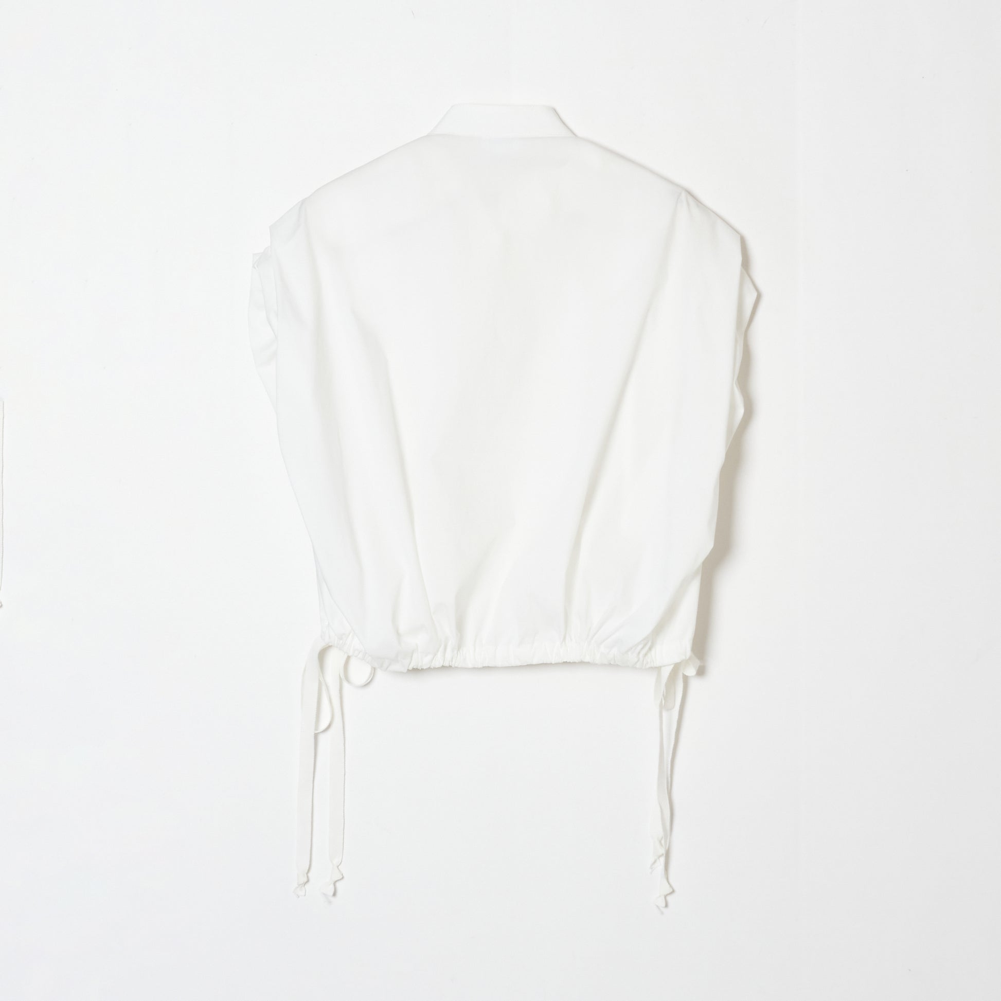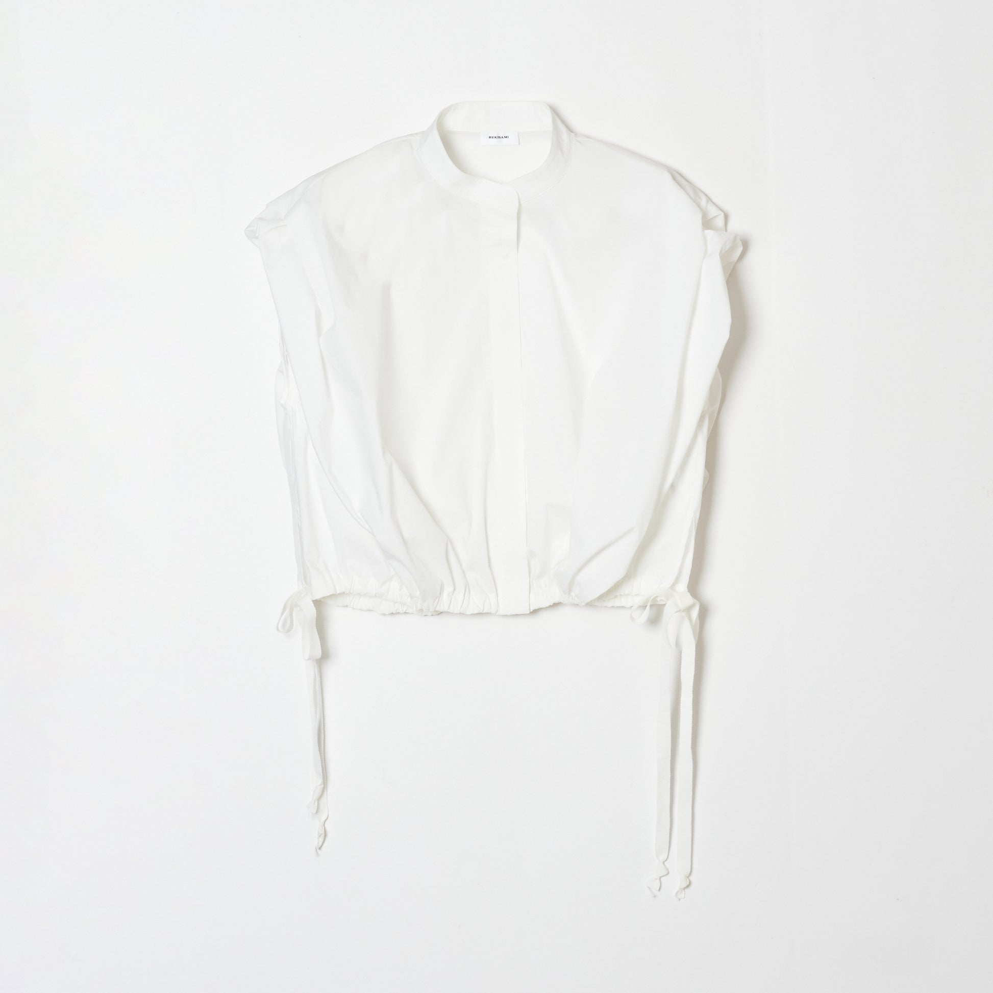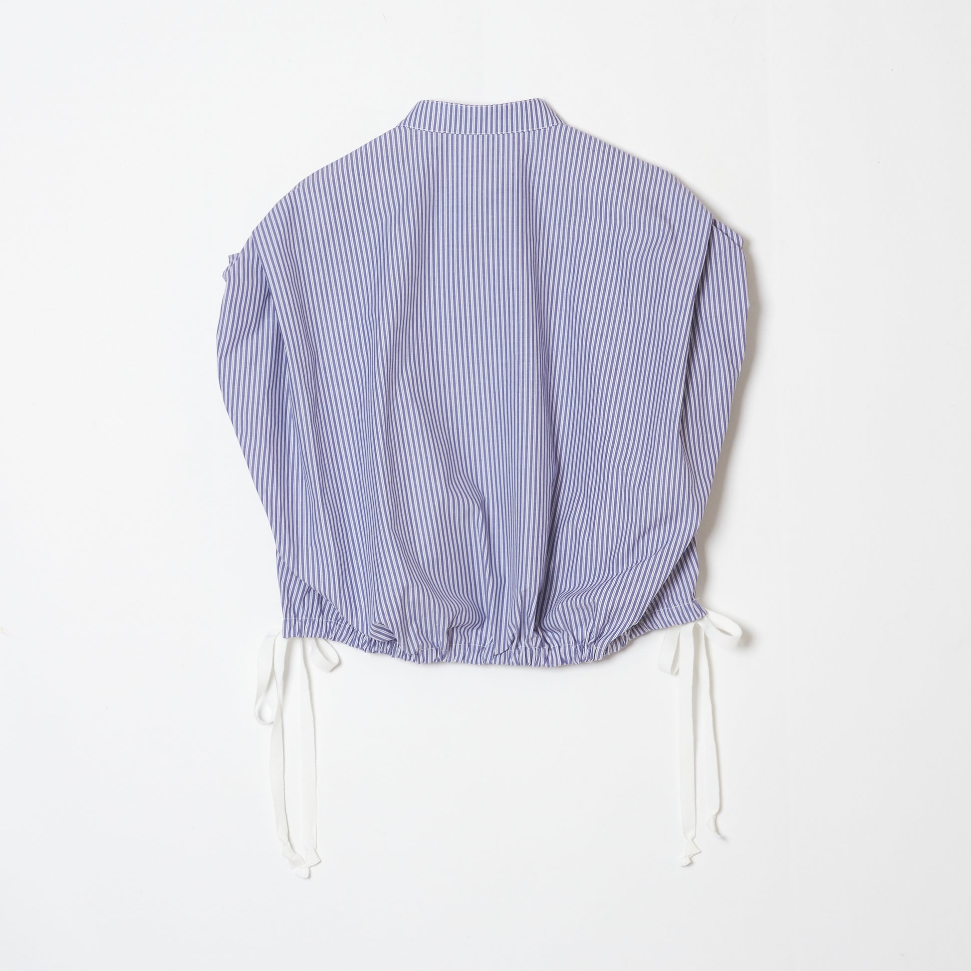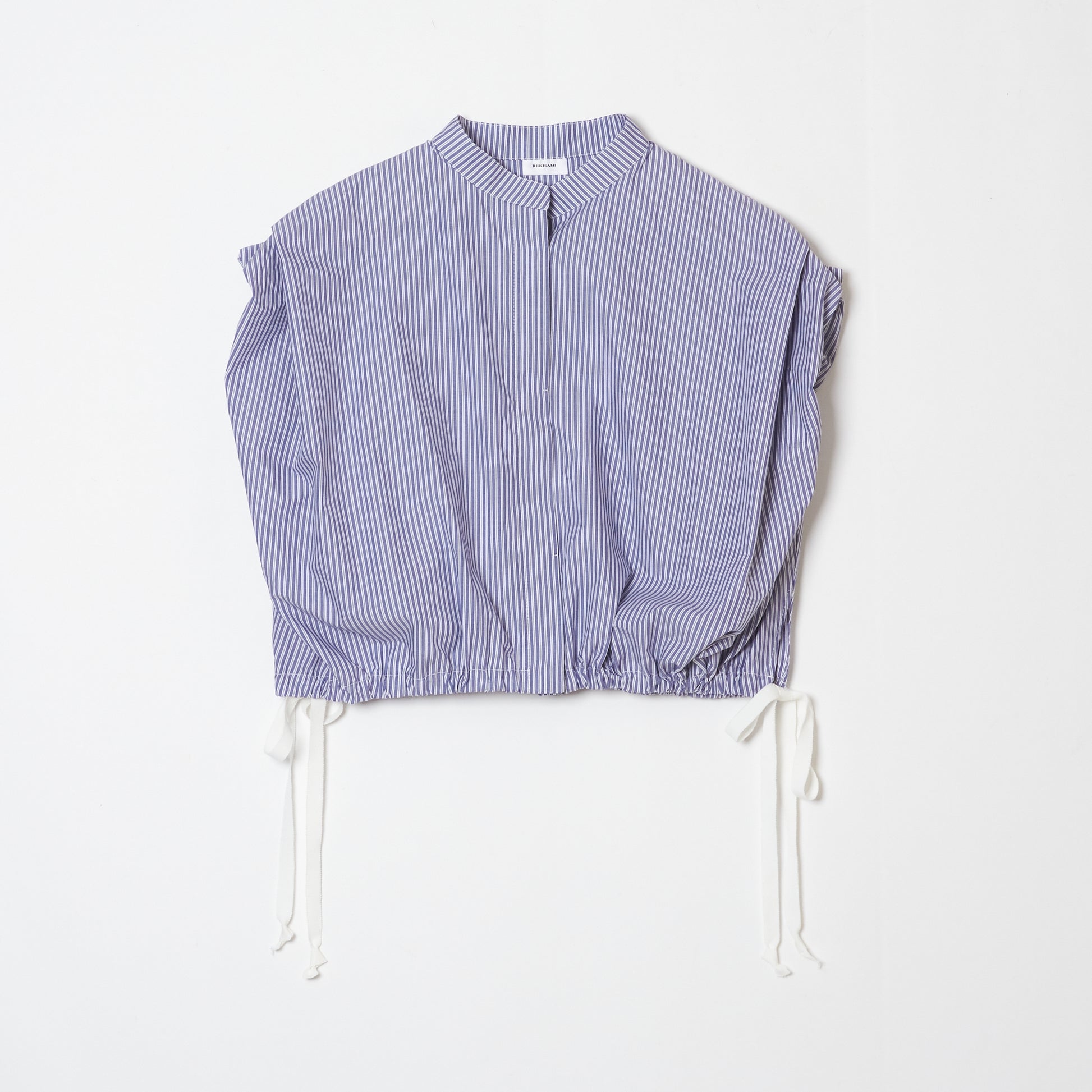 ユニークなシルエットのステンドカラーシャツは、裾の絞りで様々な形の変化が楽しめるアイテムです。短めの丈で使い勝手も良く、あわせるボトムスを選びません。