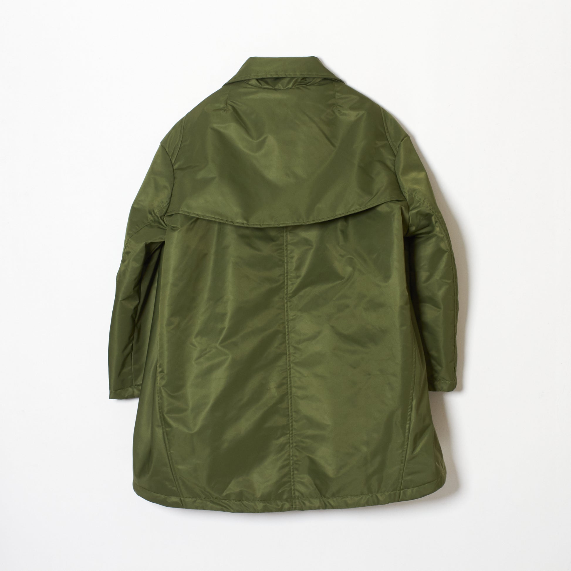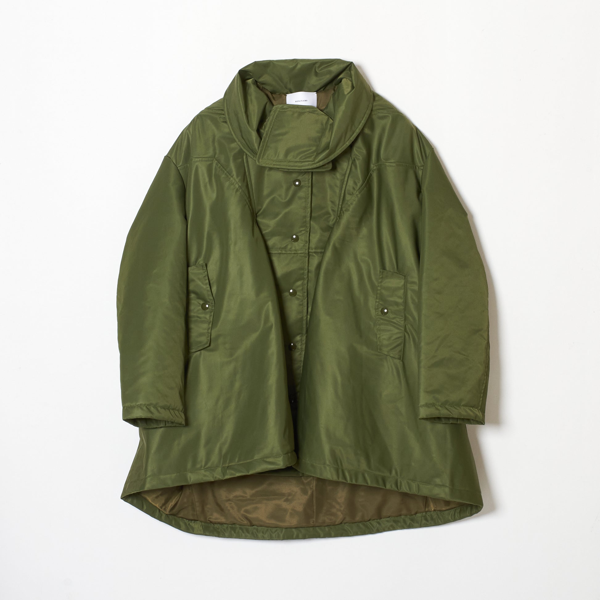 中綿入りAラインのコートで、アーミーコートからのイメージで仕上げているものです。 後ろ身頃の分量感たっぷりのシルエットで、インナーを選びません。 中綿入りですので防寒でも十分着ていただけるコートです。サイズ:1素材:100%NYLON