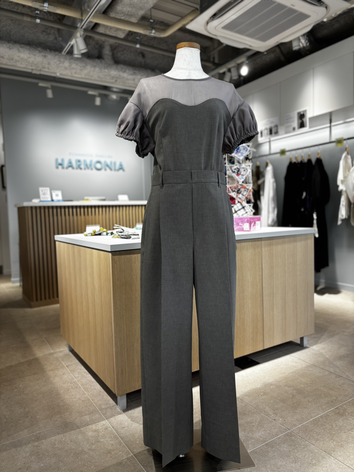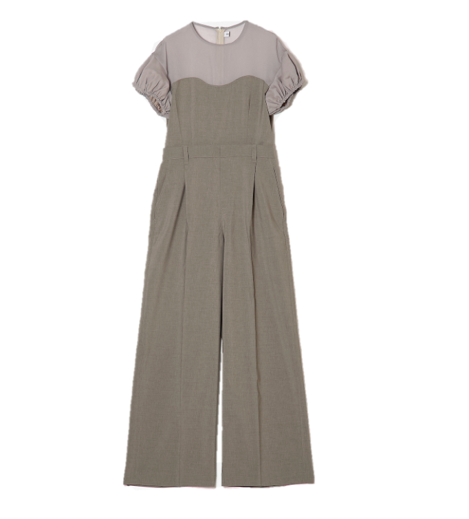 TOPがシアー素材となっているオールインワンは、合わせるアイテムでフォーマルにもカジュアルにもなる、使い勝手のいい1着です。